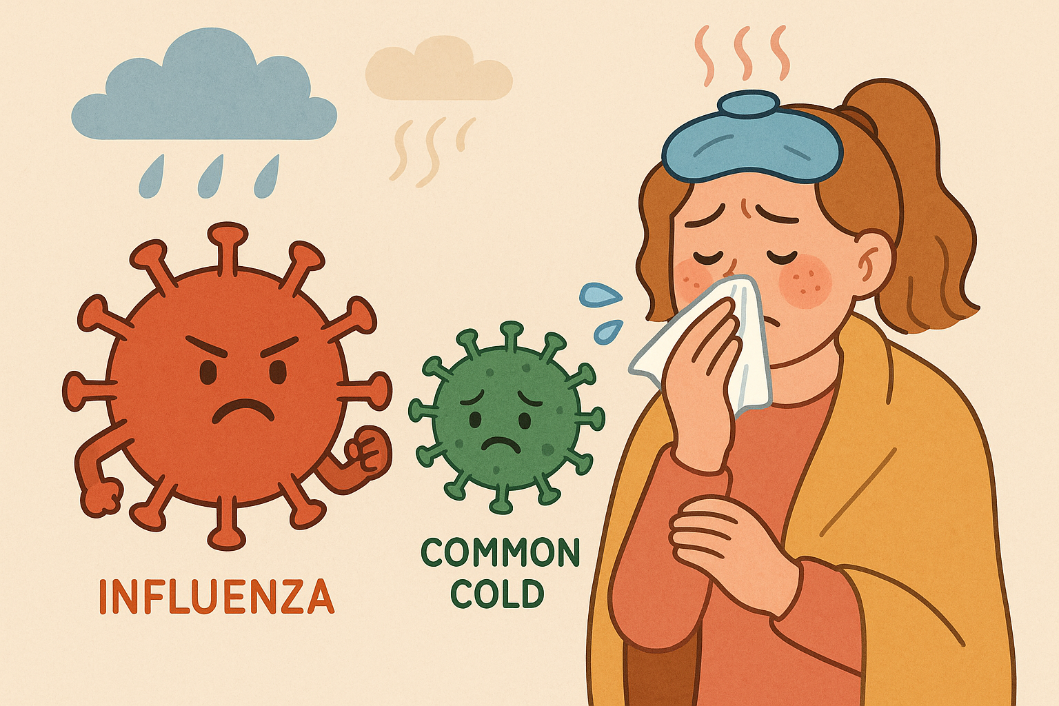 반면, 독감은 '인플루엔자 바이러스'라는 아주 강한 놈이 일으키는 전염병이에요.